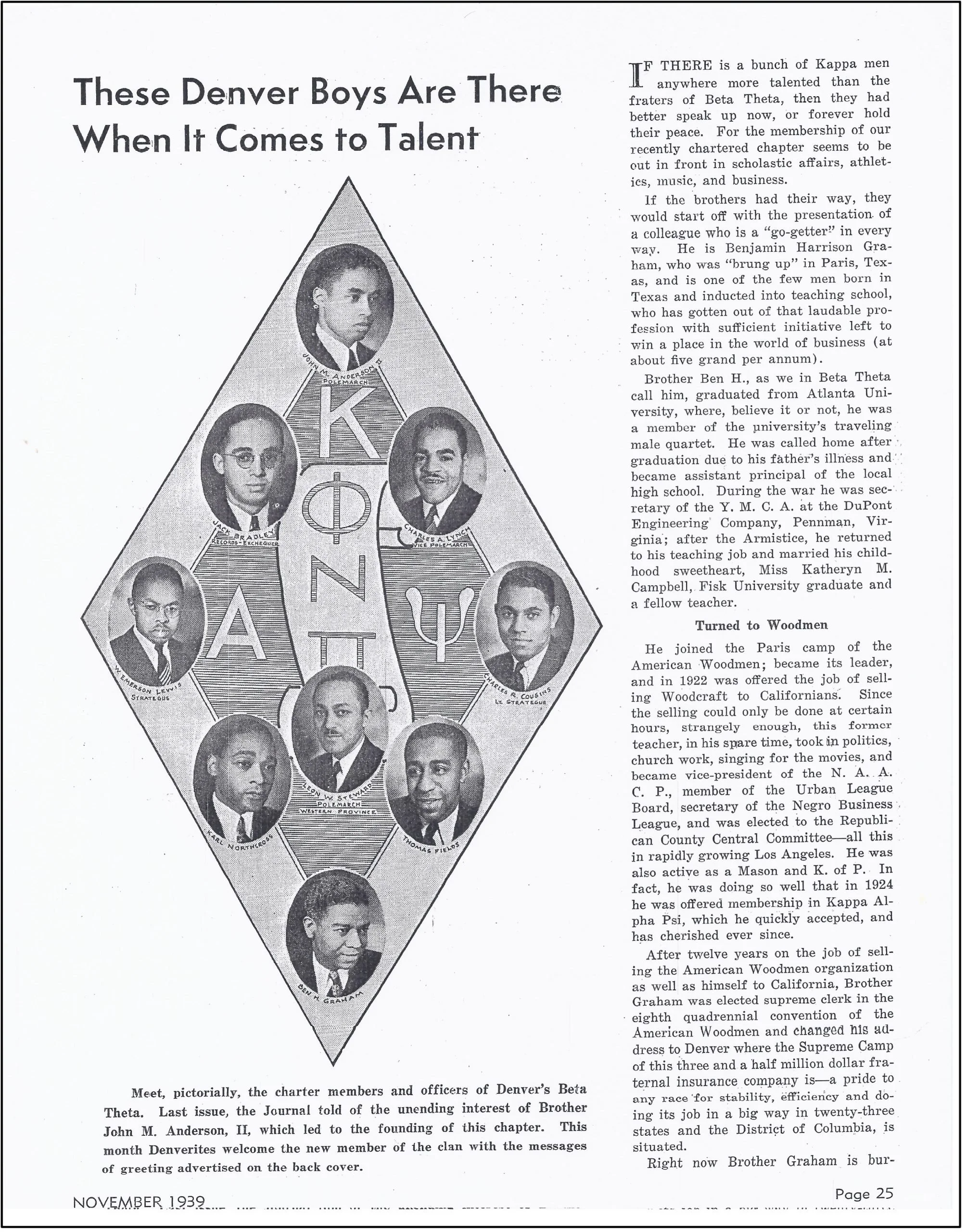 The 13th chapter of originally the Western, now the Middle Western, Province and 54th chapter chartered, the Beta Theta chapter was created May 29, 1939. Previously thought to be the Fraternity’s longest-running ‘hybrid’ chapter, research discovered indicates to the contrary – Beta Theta operated as a hybrid chapter for 15 years, from 1939 until 1954, when the Denver Alumni chapter was chartered; this is second to the Gamma chapter’s operation as a hybrid chapter for approximately 30 years. Beta Theta was the first chartered chapter of Kappa Alpha Psi Fraternity, Inc. within the state of Colorado, paving the way for future chapters such as Denver Alumni Chapter (1954), Colorado Springs Alumni Chapter (1974), and Omicron Pi (2002). We serve our communities as the originators of the Rocky Mountain Nupe Trupe ("Rocky Mountain Nupes") and the first chapter of Kappa Alpha Psi Fraternity, Inc. chartered in the state of Colorado.